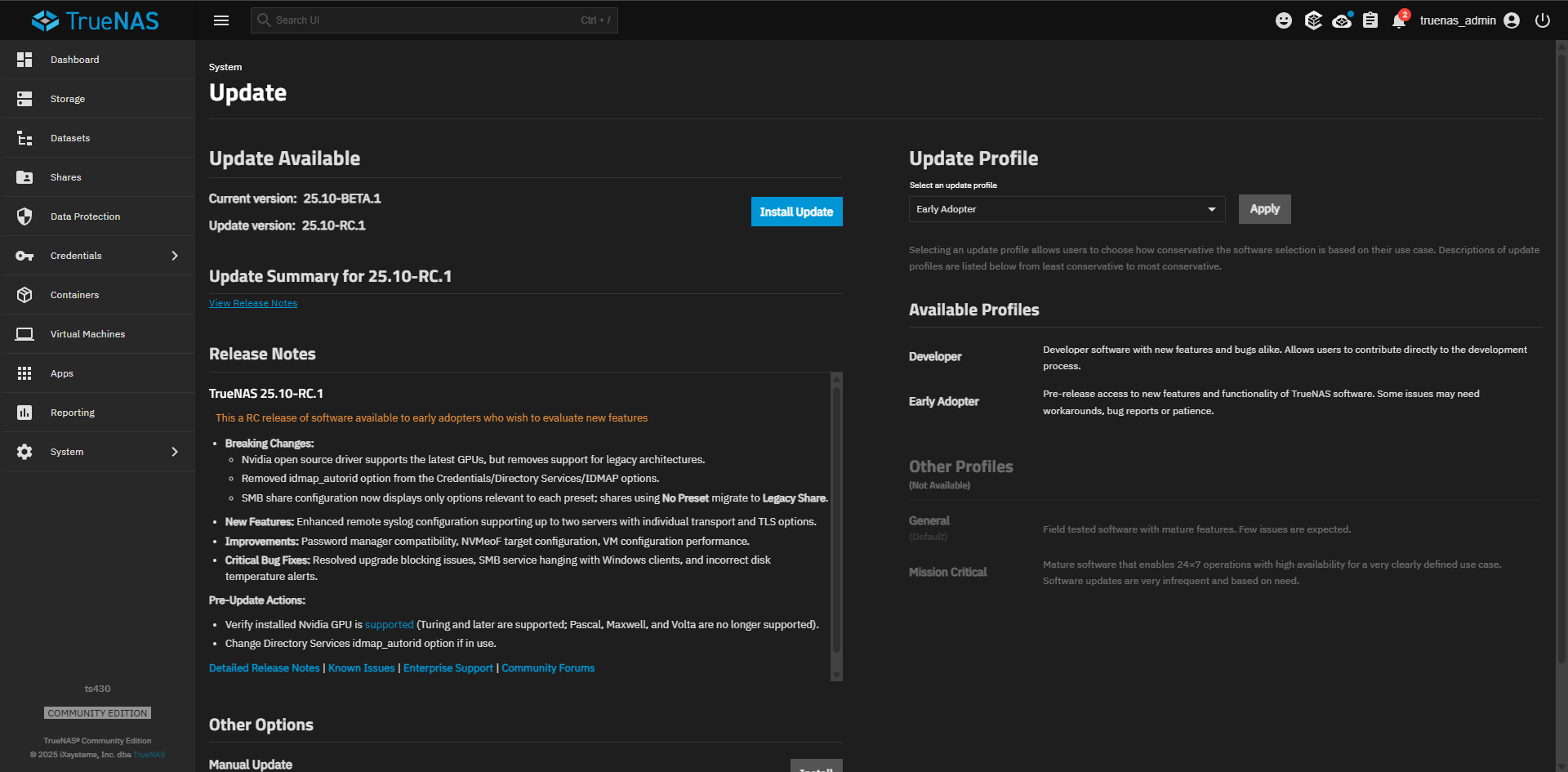 The new TrueNAS 25.10 update process overhauls the System Update page to introduce Update Profiles, making system updates simpler, more transparent, and user-centric.
