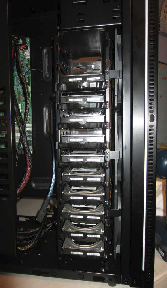 On of the things I was looking for was a system with some sort of backplane to allow the easy removal of disks. The backplane requirement and 12 disks may the choices for a system limited and expensive. My original thought was to use the iStar 4 in 3 solution in a case that could support nine or more external 5.25" devices, I use the iStar containers in my current deployment and they are wonderful. 3 of those enclosures and a case is about $400. When the Lian-Li case was on sale for less than $120 that was too good to resist. The 4 backplanes were around $80 total. For about $200, I got a case than can handle 12 disks, an E-ATX motherboard, my SSDs and tape drive. It does cable management well and when the door is closed, it looks more like a piece of furniture than a computer case! Right now, my biggest complaint is I haven't figured out how to keep it clean. There are hand prints everywhere and I want to get a cleaner that won't hurt the finish.