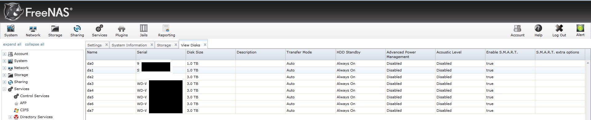 I've just put in the FreeNAS box six Western Digital 30EFRX Red drives. All of them show the correct disk serial number in the GUI. Only one is missing (da2).
