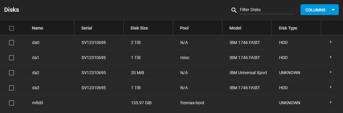 External storage is IBM 1746 FAStT that work perfectly with an older version of freenas, 9.3.
