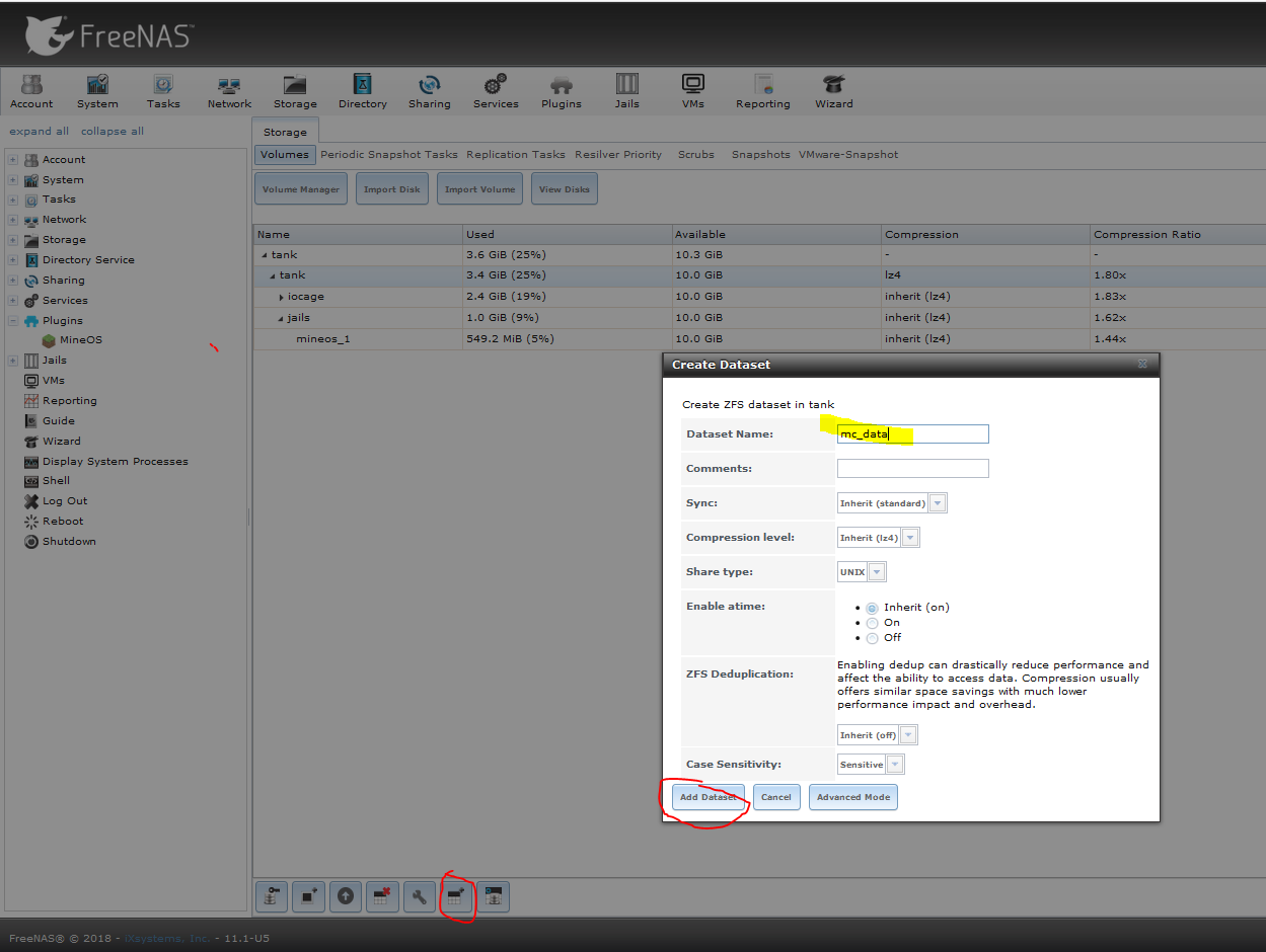 - Go to Volumes > Storage and create a new dataset, e.g. mc_data (avoid spaces)