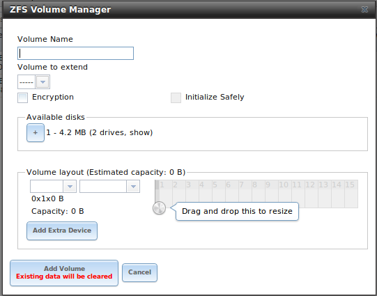 ich möchte meine 12 Platten mit zfs versehen. Diese 12 Platten habe ich in einem externen Storage und sind noch jungfräulich. Sprich ausgepackt, eingebaut freenas auf einem schon vorhandenen vorhandenem RAID1-SAS Verbund installiert. Nun wollte ich per WEB-IF diese zu einem Pool hinzufügen aber irgend wie komme ich nicht weiter. Ich finde den Punkt nicht, wo ich die Platten hinzufügen kann.