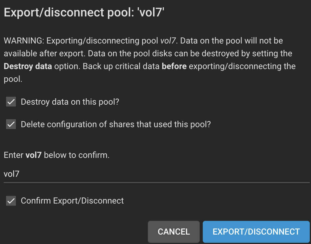 That way, all of your disks are freed (if you select the option to quick wipe them) to be part of another pool (which you can then create).