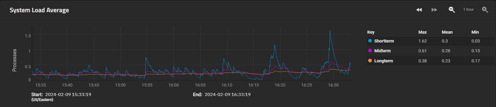 The backup server is a Xeon E3-1220v3. The CPU reporting shows that it's mostly idle, but the load never drops below 1 for any of them. The short term occasionally spikes to 2-3 for a minute or two but then drops back down to around 1. I'm not sure what's causing the spikes.