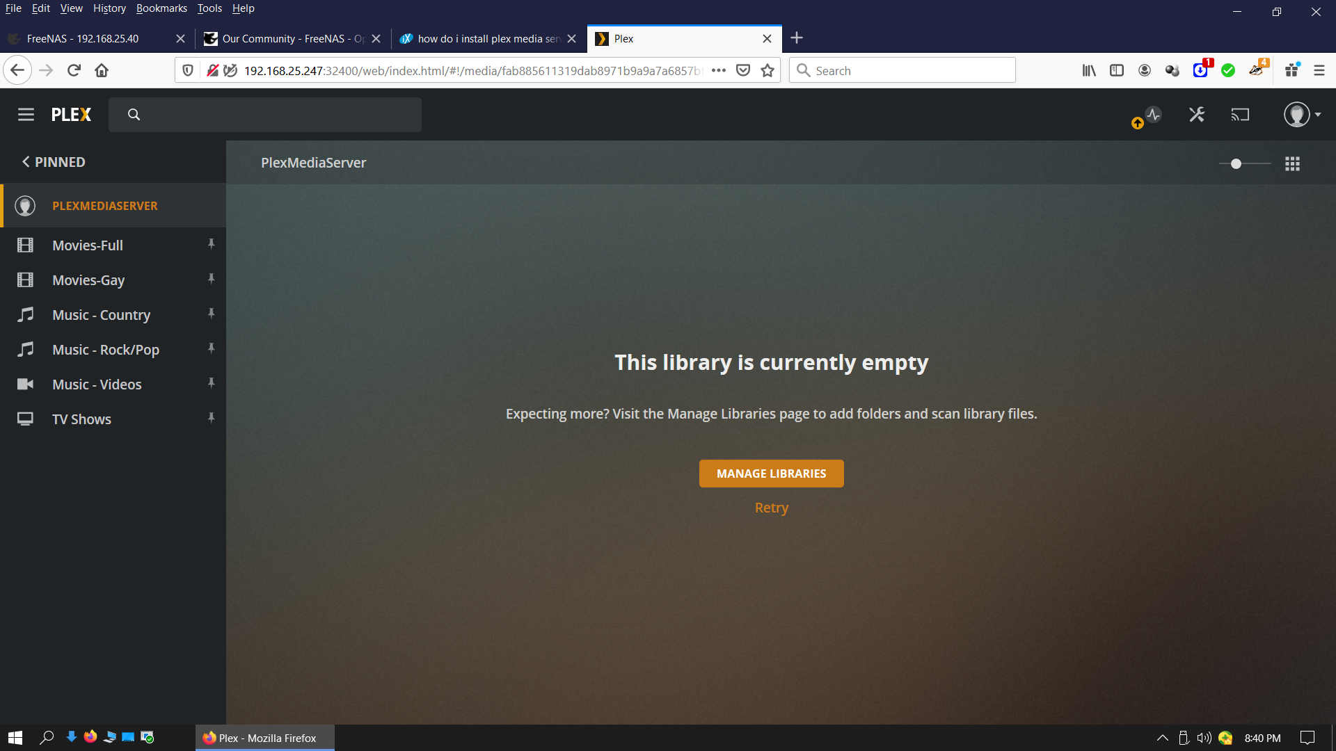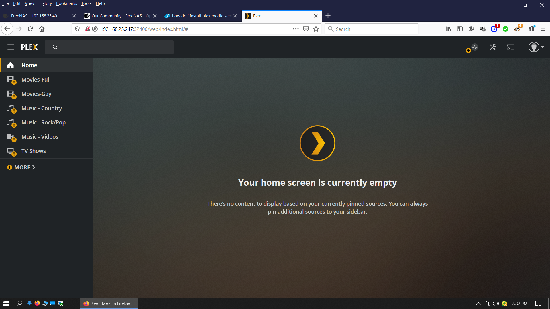 I have lots of media librarys pinned to home screen plex still insists there isn't anything there;