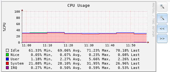 As for figuring out what it is, you could try opening a SSH terminal to the server and running top so that you can see what process is using the cycles. It will give you a list like this that constantly updates: