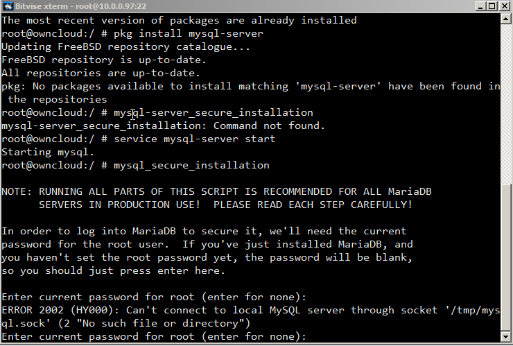 sockstat will show what sockets you have open. also, you installed mysql instead mariadb100, it might a different default socket.Ok. So I started MySQL-server, then tried to run "MySQL_secure_installation" again. I get the same error. See below...