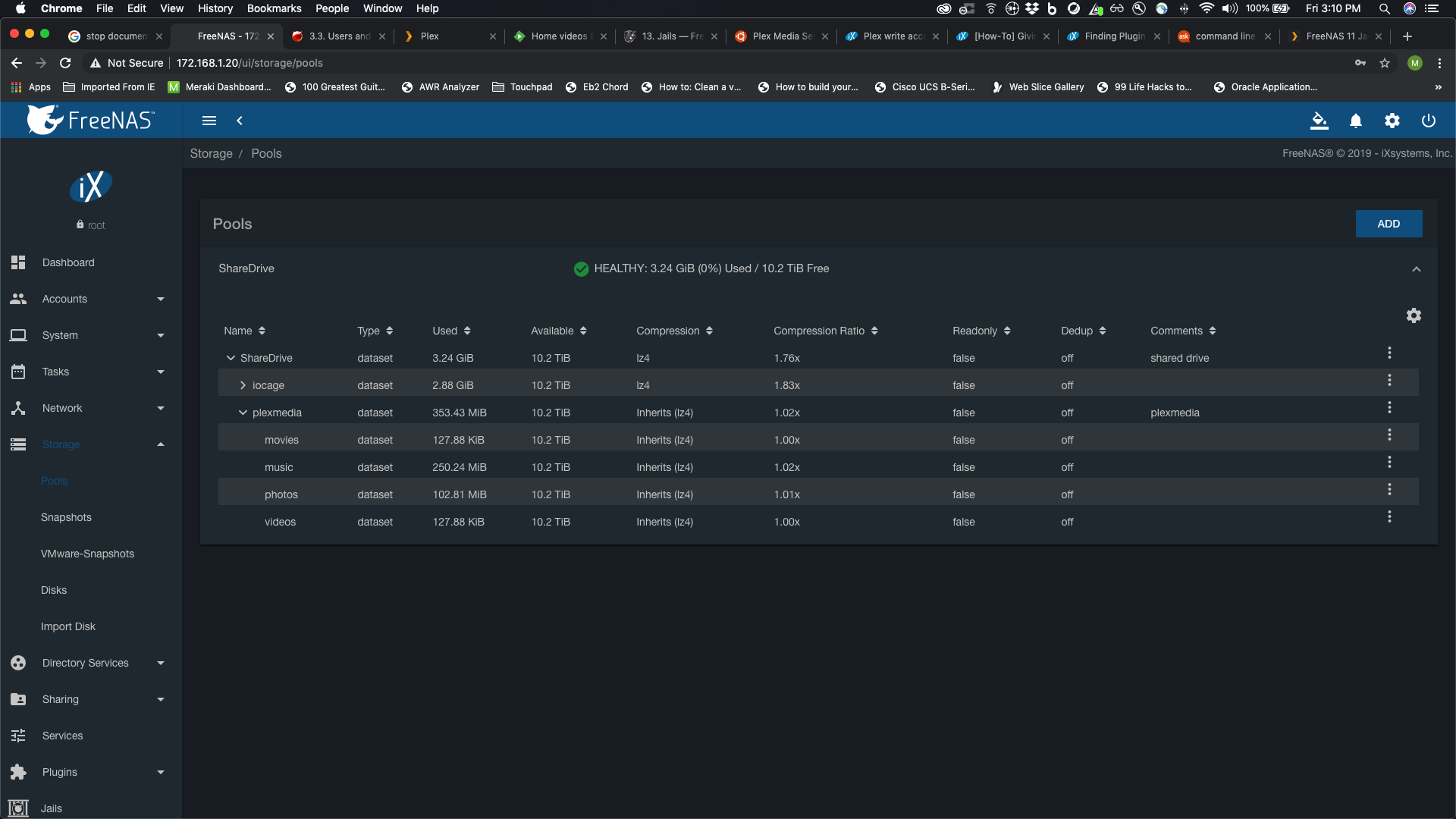 The issue is as follows. i have placed test data into a couple of Plex Media Libraries (Music and Photos). The Plex Media server will not find any media copied to the Source. The Plex Jail seems to be setup properly according to documentation. The storage is mounted as such: