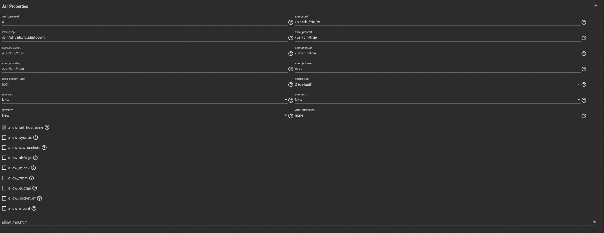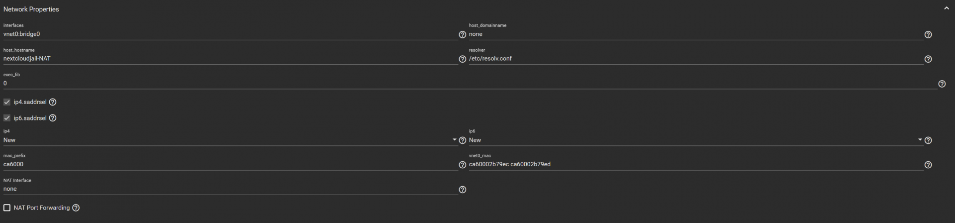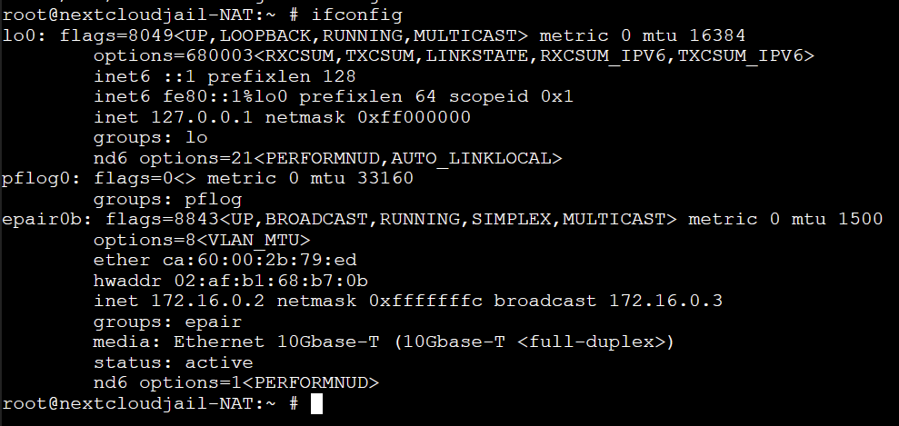 It also caught my attention that no ip address is listed when I run ifconfig in the jail's console. But I guess there is not supposed to be one since I set it up with NAT. (Unfortuanely, I can't find a way to select text to copy in the Web GUI's shell-window, so here's another screenshot:)