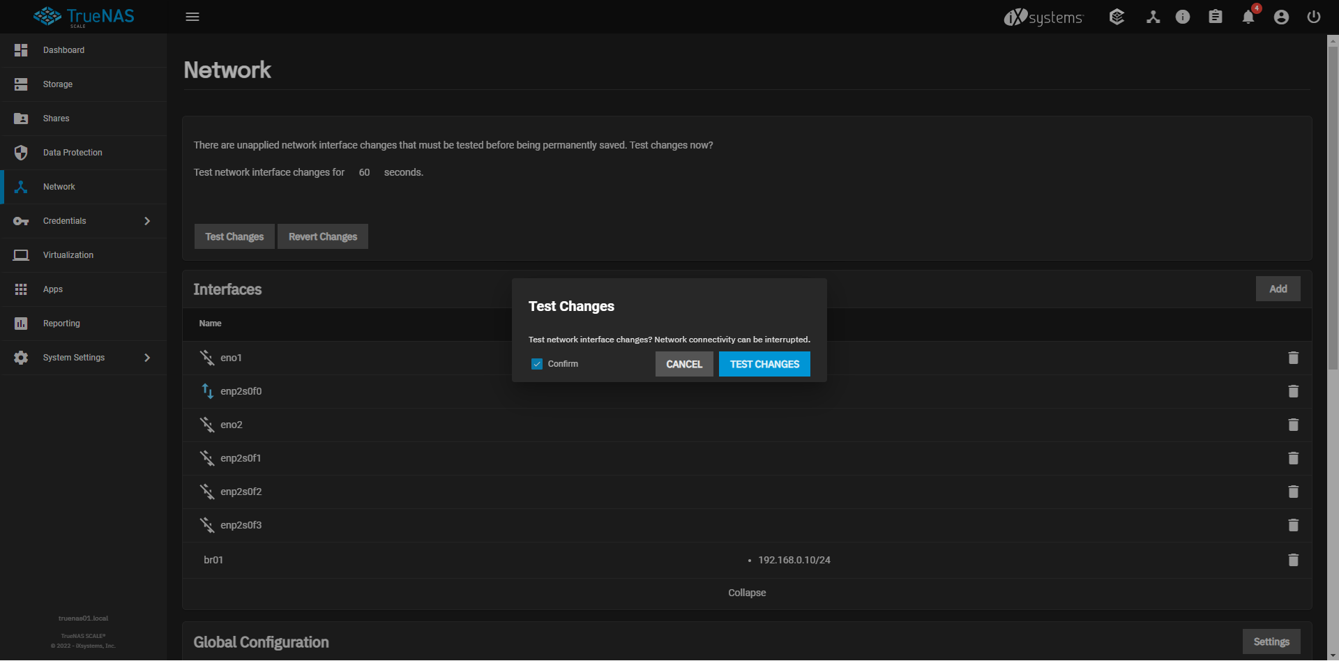After clicking Test Changes, the UI will have the modal appear that it's testing the changes with the spinner and the other text box that appears (Connecting to TrueNAS?). During that time, I opened another tab to access the UI and it brought me right back into the config with the Save Configuration option present.