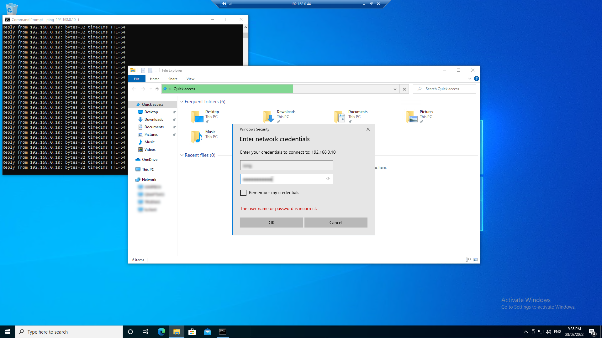 5. Find IP of VM (through display and the usual IPCONFIG in the VM) then use RDP for better visuals. Ping BR01 (for my test it was 192.168.0.10)