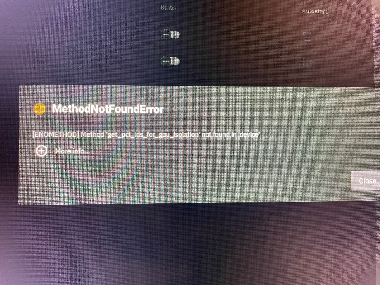 middlewared.service_exception.CallError: [EFAULT] internal error: process exited while connecting to monitor: 2024-01-08T03:03:17.695164Z qemu-system-x86_64: -device {"driver":"vfio-pci","host":"0000:04:00.0","id":"hostdev0","bus":"pci.0","addr":"0x6"}: vfio 0000:04:00.0: failed to setup container for group 51: Failed to set group container: Operation not permitted