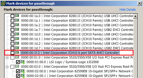 Very interesting...VMware doesn't give me the option of passing through the Intel SATA controller on my newer X10SL7 board but it does on my older X8SIE system: