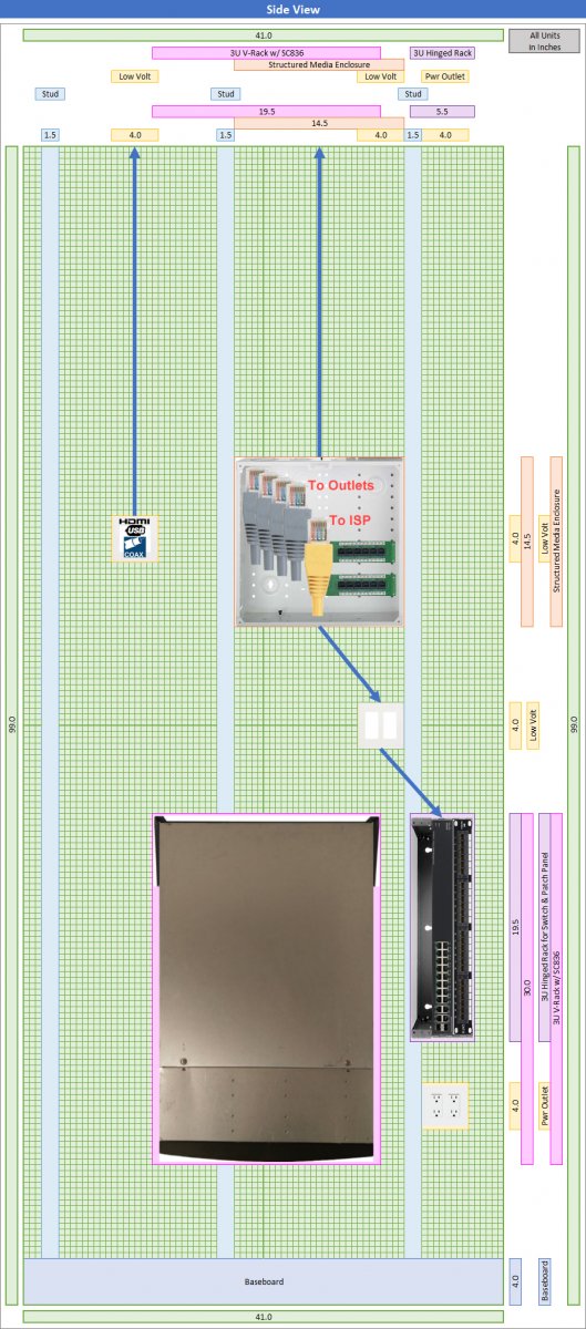 I took a moment to diagram out what this will look like when complete (I needed to this for myself as I start installing). Sorry for the large images, and there are probably better ways to do this; however, I've always done this sort of thing in MS Excel setting the cells to squares with values for measurement purposes.