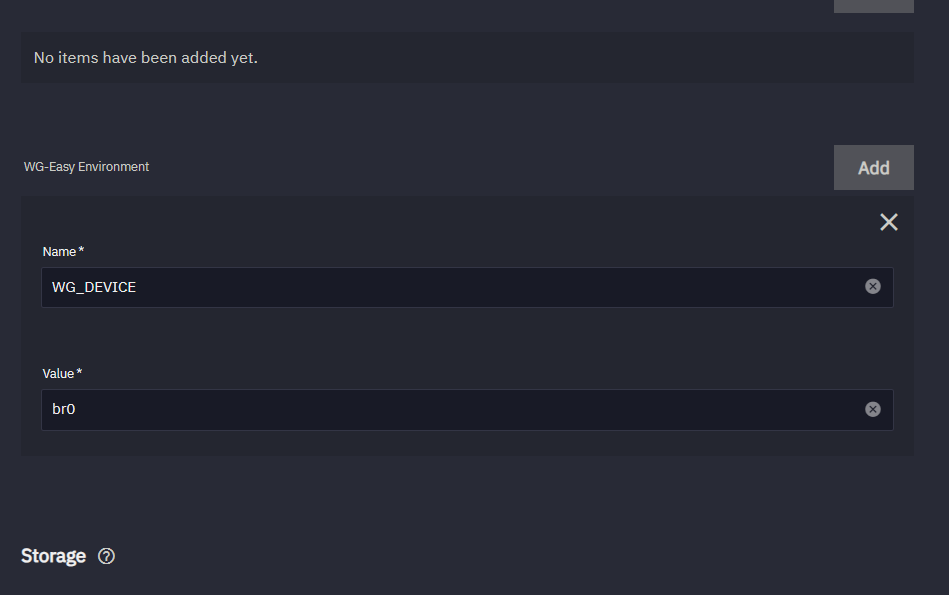 - Go into the the app setup. Go down to the section “WG-Easy Environment”. Add an Environment Variable: