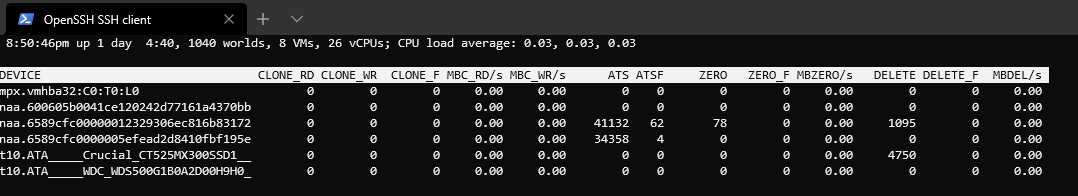 esxtop go to the u for disk device stats, then hit f for field changes and make it so that only A and O (NAME and VAAI Stats) are visible. Do you have values under the ZERO or DELETE columns? A proper VMFS setup should pass the UNMAP commands through and register them as DELETE - if you're seeing ZERO it might not be configured for UNMAP.I do have plans to replace all drives with schucked 8tb elements, but I have mostly been waiting for drive failures. I got all my drives for free and they are pretty darn old. I have 1 free drive left and then I have 1 8tb that I have already schucked and started to buy. I suspect over the next year I will start replacing the drives. (Going with 8tb elements because WD has no SMR at 8tb or above and its cheaper to buy elements than it is to buy 4tb red pros. Would rather upgrade now than buy 2TB and upgrade in a year or two.)