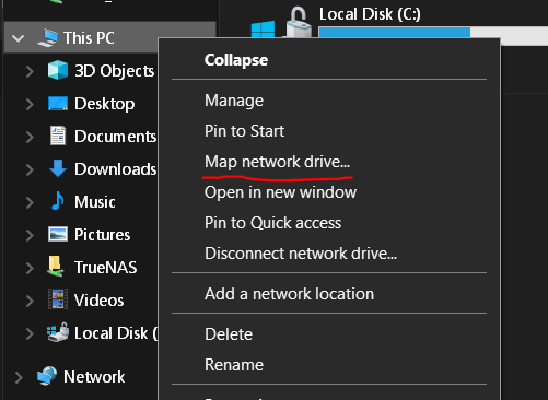 Now go to windows explorer, then right click on ThisPC -> map a network drive: