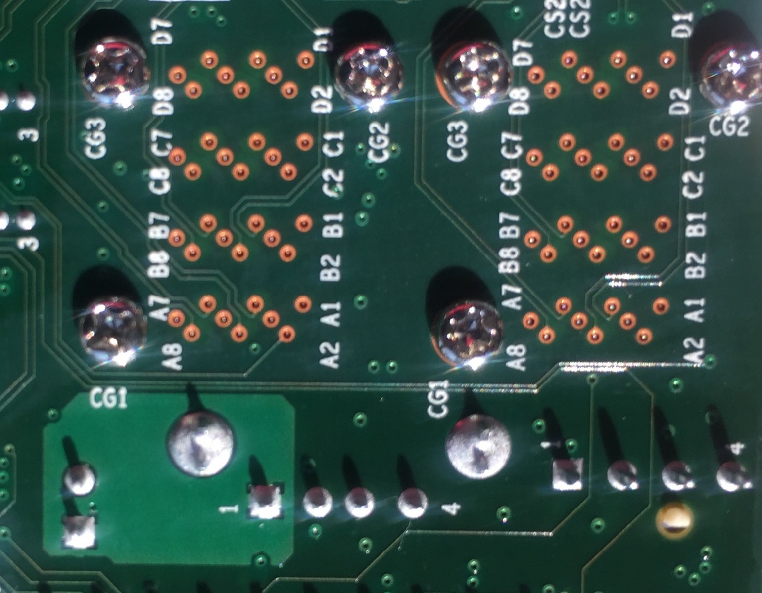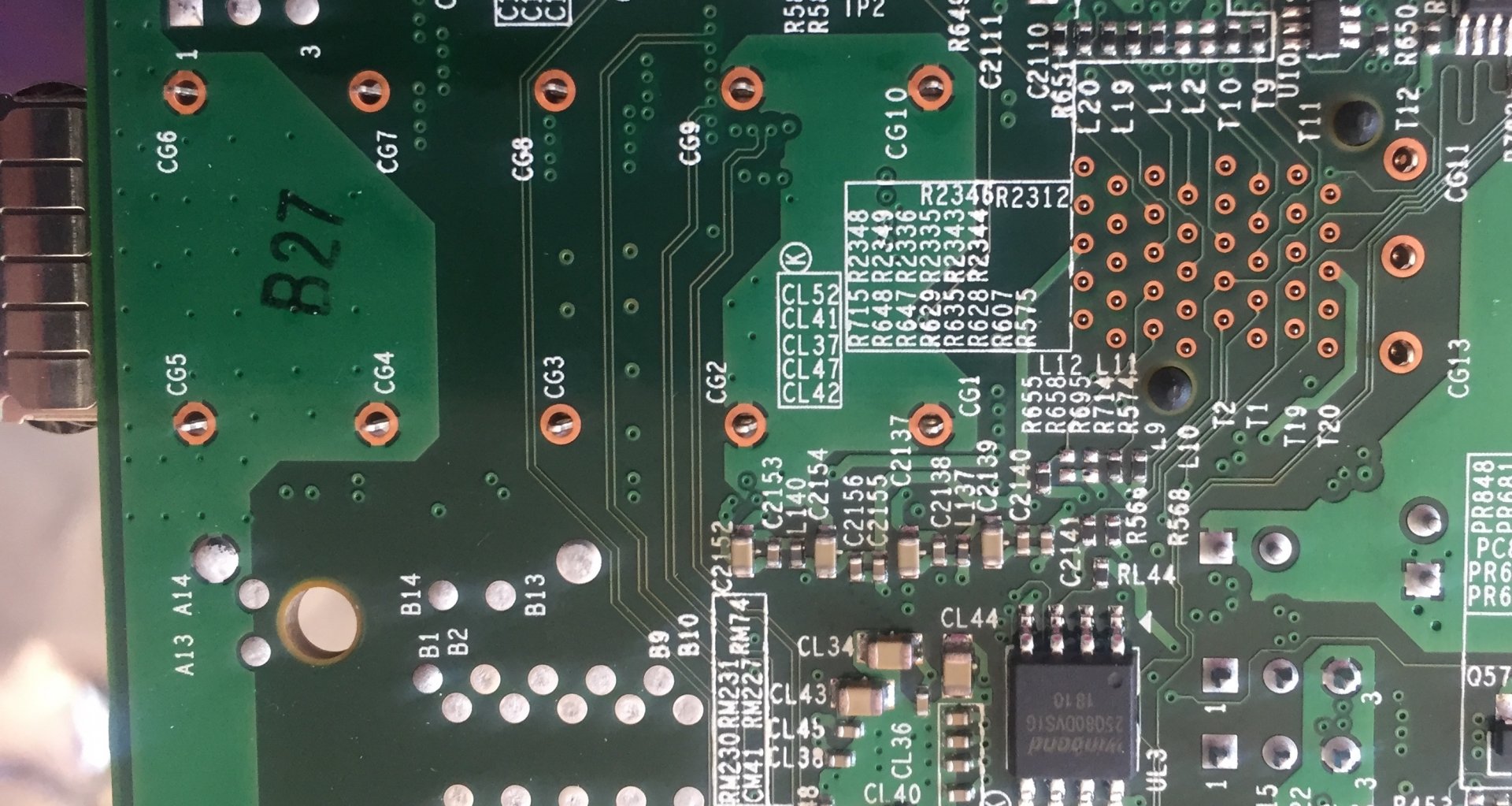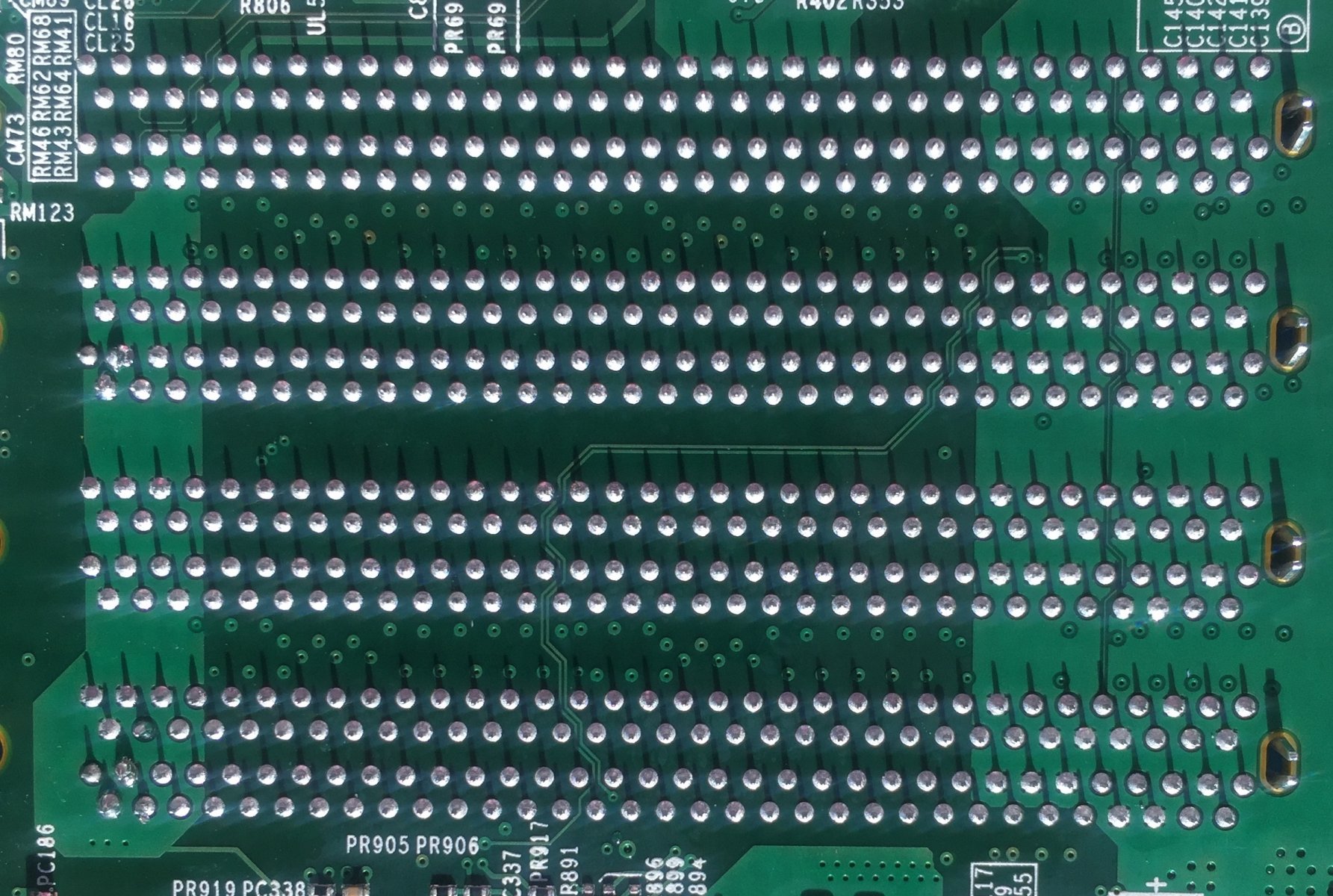 Contrast the SAS2/SFP+ pin / via combinations with those of the the PCIe or RAM connectors, which all feature little circular solder tents on their pins, as expected.