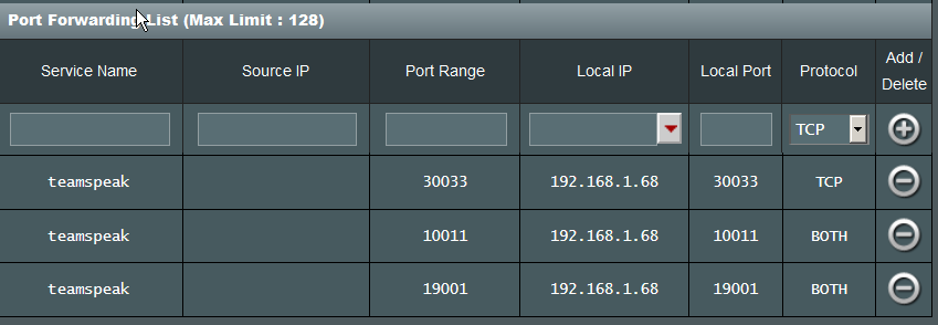 what is the 19001 (do i need that too?) or did you just reassign 9987 to that?This varies a bit depending on your router. You set them up individually, and 9987 is the most important since it caries voice (10011 is the servery query port and I can't remember what 30033 is) Here is how I have mine set up: