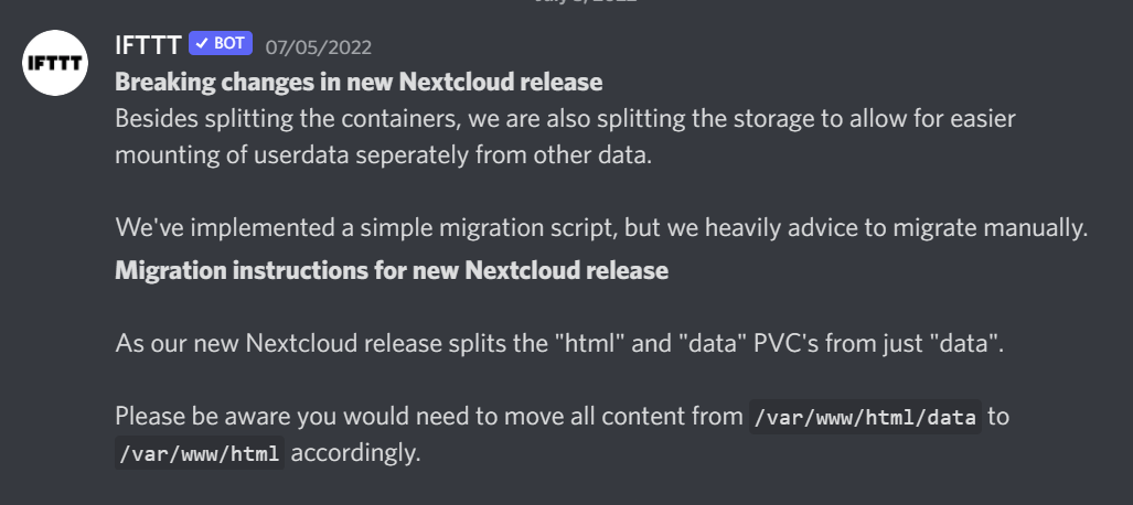 Please always be aware that major (first digit) updates in semantic versioning, mean "potentially breaking". Which is the same for both TrueCharts Apps as-well-as Nextcloud itself. In this case this mostly refered to changes in our storage backend, which got changed due to many users requesting seperation of userdata from config/app data.
