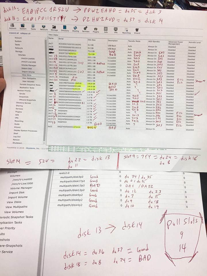 All this came about because we ran out of slots in and had to hunt down bad disks for removal. Since we have 25 slots, when a drive is replaced, it doesn't always get immediately pulled. Finding bad active disks, bad inactive disks from among the good disks is time consuming because of flipping back and forth between screens. I ended up creating this obnoxious document...