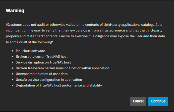 Third-party app catalogs available for TrueNAS are provided and maintained by individuals or organizations outside of iXsystems.