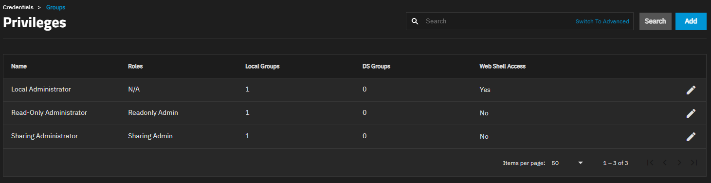 | Privileges | Attaches administrator role privileges to the group. Using custom administrator roles aside from the defaults is an experimental feature and is not supported. Do not modify the local administrator or default admin user privileges! Only use if you need users in this group to access limited areas of the web UI or authentication for TrueNAS API calls. |