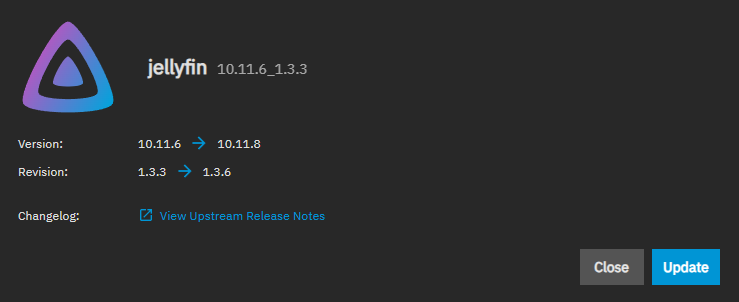 Update opens an update dialog showing the version change. When the upstream application version is changing, the dialog shows a Version row with the current and new upstream versions. The dialog always shows a Revision row with the current and new catalog revision numbers. When multiple catalog revisions are available, a Version to be updated to dropdown appears with options in the format Version: X / Revision: Y. A View Upstream Release Notes link appears when the app provides a changelog URL.