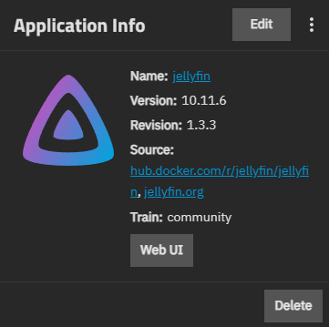 Delete opens the Delete dialog. This deletes the application deployment but does not remove it from the catalog or train in TrueNAS.