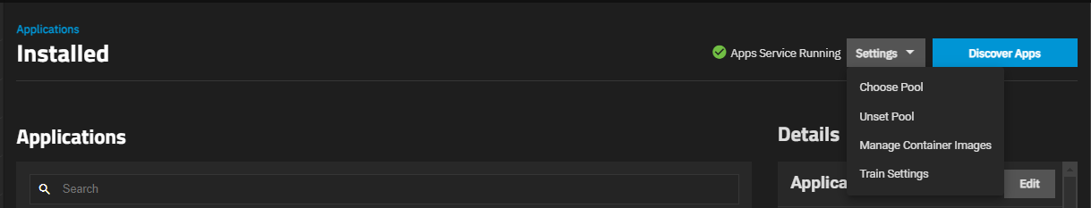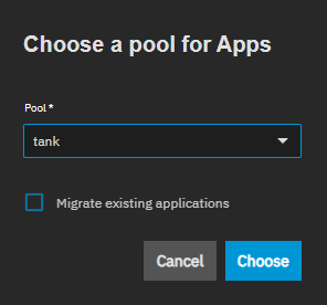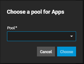 The first time you open the Installed applications screen a dialog prompts you to choose the pool for apps to use for storage. Select the pool from the dropdown list, then click Save. This starts the applications service. If you exit out of this dialog, to set the pool, click Settings > Choose Pool to select a storage pool for apps.