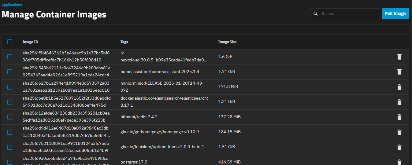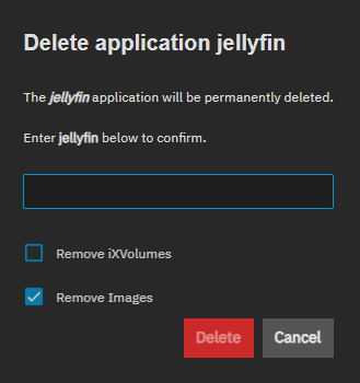 | Force-Remove iXVolumes | Deletes app storage created on TrueNAS 24.04 and migrated to 24.10 or later. Only shown when Remove iXVolumes is selected. Removes both legacy Kubernetes and current Docker data for the application. Use with caution. |