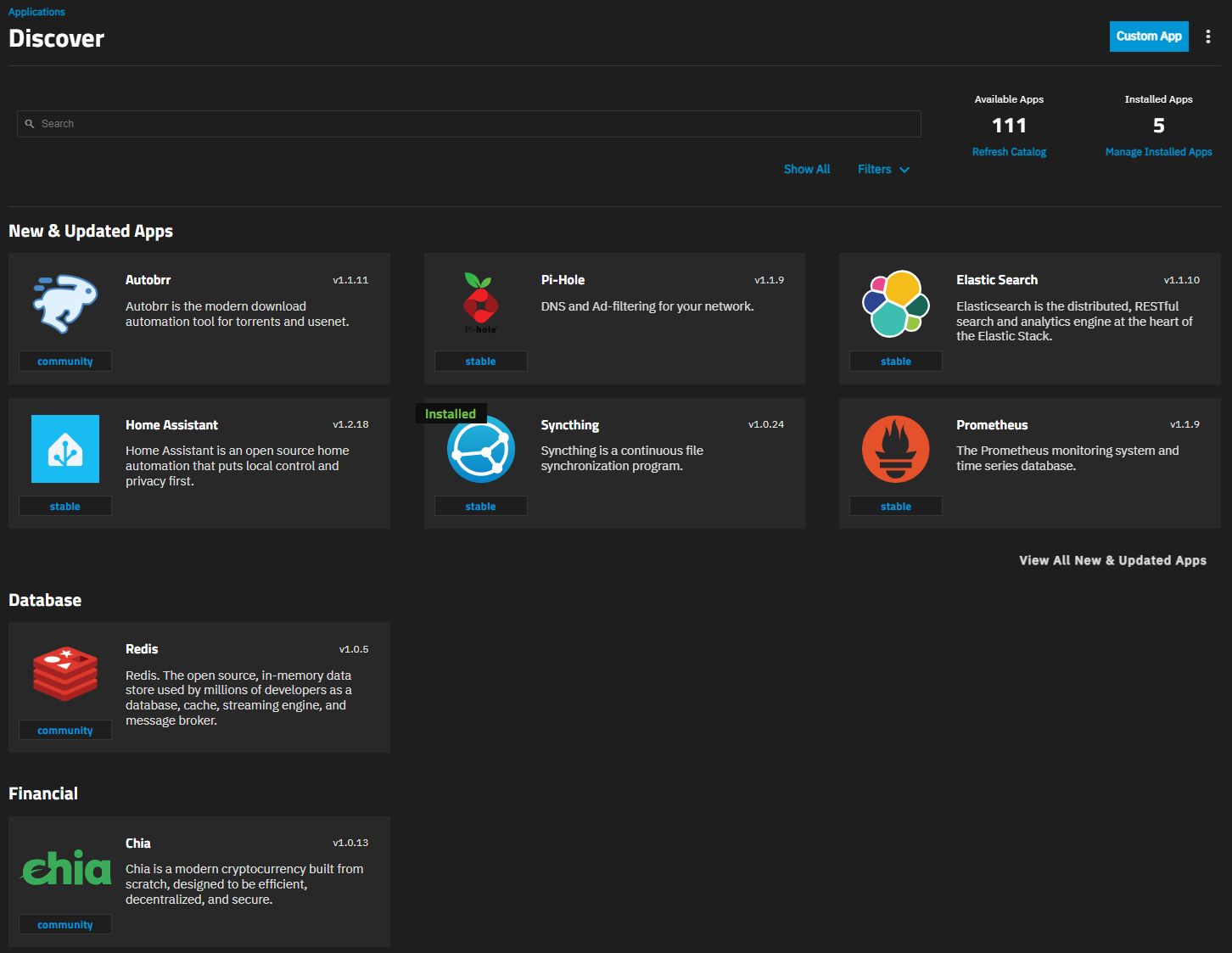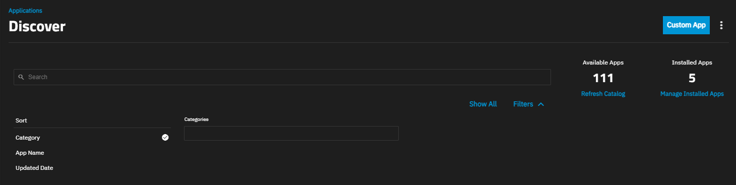 The TrueNAS Applications Market is your new resource for the latest details about apps available within TrueNAS. Discover which apps are widely used or recently added, filter the entire catalog to find the perfect app, and learn specifics that can help you deploy an app.