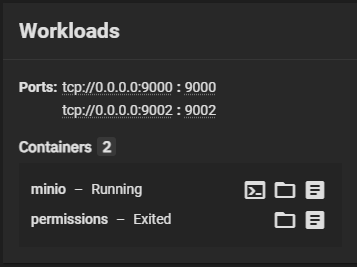 The Workloads widget shows the container information for the selected application. Information includes the number of pods, used ports, number of deployments, stateful sets, and container information. It also shows the Shell, Volume Mounts and View Log icon buttons that provide access to the container pod shell and log screens and mount point windows. The option to access the log and the shell remain available for stopped applications for fully deployed application containers, and for applications in the crashed state.