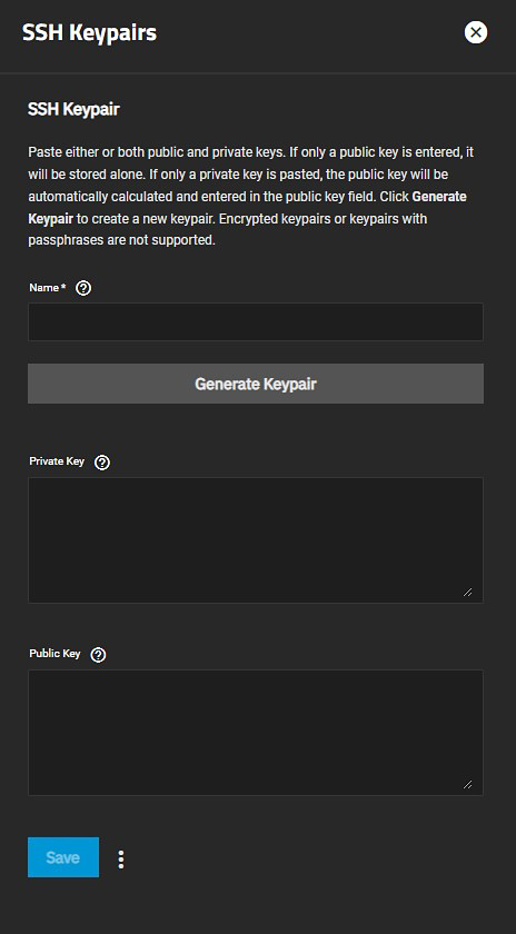 | Generate Keypair | Click to have TrueNAS automatically generate a new key pair and populate the Private Key and Public Keys fields with these values. |