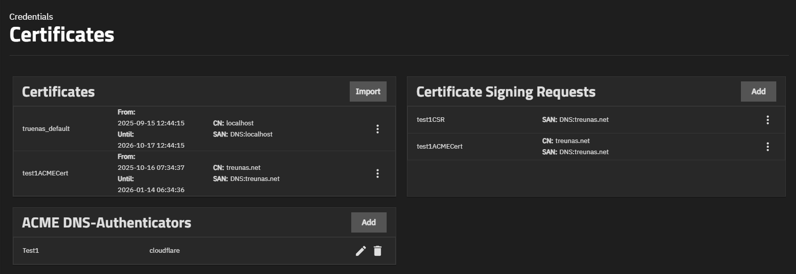 Use the Credentials > Certificates screen to manage certificates, certificate signing requests (CSRs), and DNS authenticators with the Certificates, Certificate Signing Requests (CSRs), and ACME DNS-Authenticators widgets.
