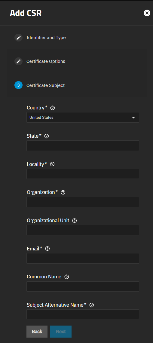 Enter the Certificate Subject settings. When entering values, enter short values for the geographic information, where possible. For example, enter TN instead of Tennessee for the State. Enter all required values (indicated by the asterisk).