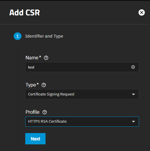 Select or enter the certificate options for the CSR. TrueNAS shows default settings in each field. Key Type shows the option matching the selection made in Profiles in step 1. Accept the default values or choose the number of bits in the key used by the cryptographic algorithm, and the cryptographic algorithm the CSR uses.