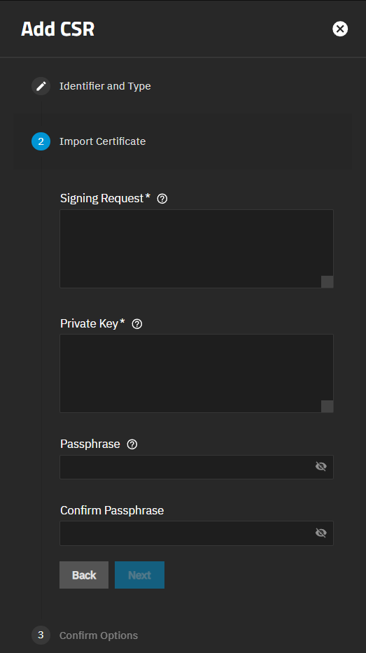 Enter or copy/paste the certificate string into Signing Request, then enter or copy/paste the private key into Private Key. Enter the password for the private key in Password and Confirm Password. Click Next, review the information, and then click Save.