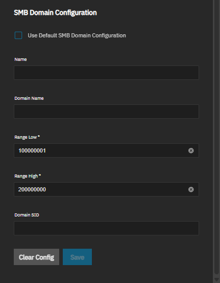 To customize SMB domain settings, clear Use Default SMB Domain Configuration to reveal additional configuration options: Name, Domain Name, Range Low, Range High, and Domain SID.
