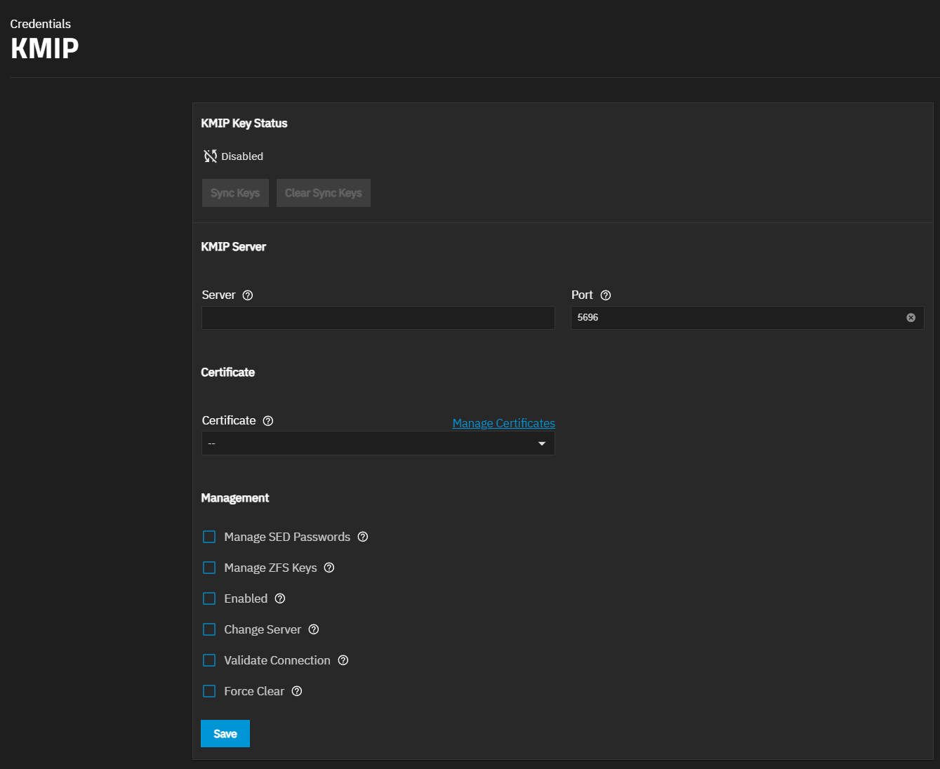 Enter the central key server host name or IP address in Server and, if not using the default port 5696, enter a number for an open connection port on the central key server in Port. Select the certificate imported from the central key server in Certificate. To ensure the certificate chain is correct, click on Validate Connection. Click Save.