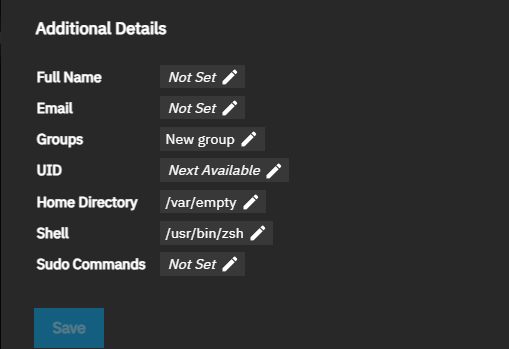 When Shell Access and SSH Access are assigned to the user, the Shell and Sudo Command settings show in the Additional Details section.