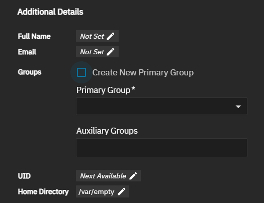 Select Create Home Directory, then enter or browse to select the path to the dataset for home directories in Home Directory. For example, change /var/empty/ to the path to a new dataset.For example, /tank/homedirs.