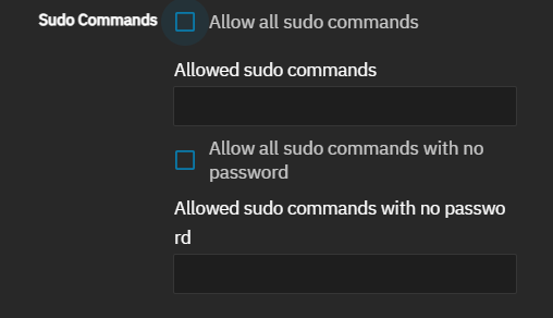If required, set the sudo permissions to assign. For improved security, temporarily enable limited sudo permissions only when required to complete an administrative task and disable sudo after completing the task. See Allowing Sudo Commands for more information.