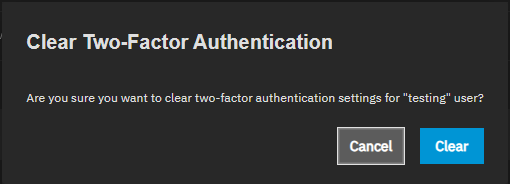 The Clear Two-Factor Authentication button only appears for users who have 2FA configured. Users without 2FA configured do not show this button.A confirmation dialog appears asking if you want to clear two-factor authentication settings for this user.