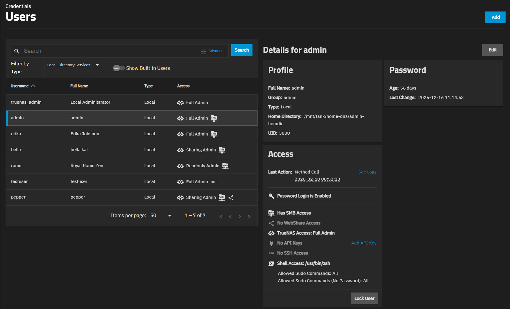 To improve security and minimize username discoverability, create one or more administrator accounts with unique usernames and passwords and disable password access for default administrator accounts (root, admin, or truenas_admin). Configure appropriate administrative privileges for each admin account. Follow the principle of least privilege (PoLP) and assign the lowest permissions required to perform the administrative tasks expected for that user. If a task requires SSH login or sudo command permission, temporarily enable these settings then disable when the task is complete. See Security Recommendations and Allowing Sudo Commands for more information.