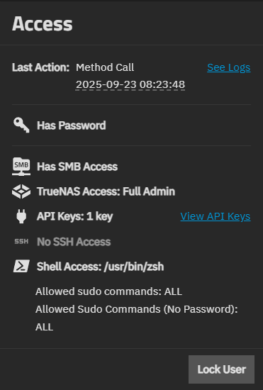 Root account logins are deprecated in TrueNAS Bluefin 22.12.0 or newer for security hardening and to comply with Federal Information Processing Standards (FIPS). All TrueNAS users should create an administrator account with all required permissions and begin using it to access TrueNAS. When the root user password is disabled, only an administrative user account can log in to the TrueNAS web interface.