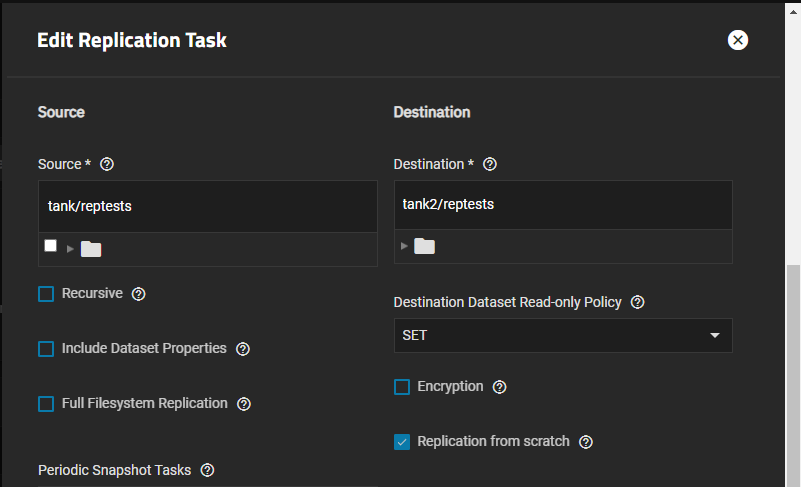 TrueNAS replication allows users to create replicated snapshots of data stored in encrypted pools, datasets or zvols as a way to back up stored data to a remote system. You can use encrypted datasets in a local replication.