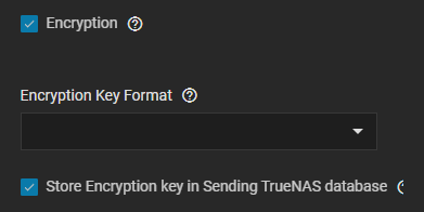 Select Store Encryption key in Sending TrueNAS database to store the encryption key in the sending TrueNAS database or leave unselected to choose a temporary location for the encryption key that decrypts replicated data.