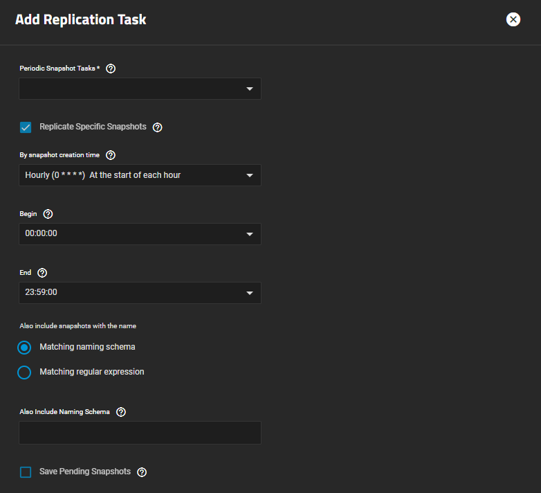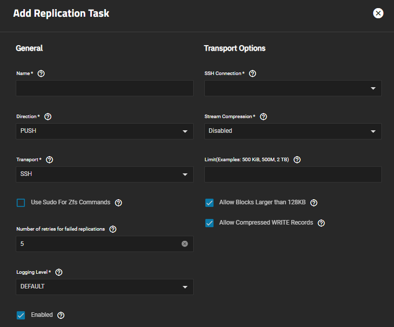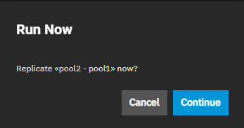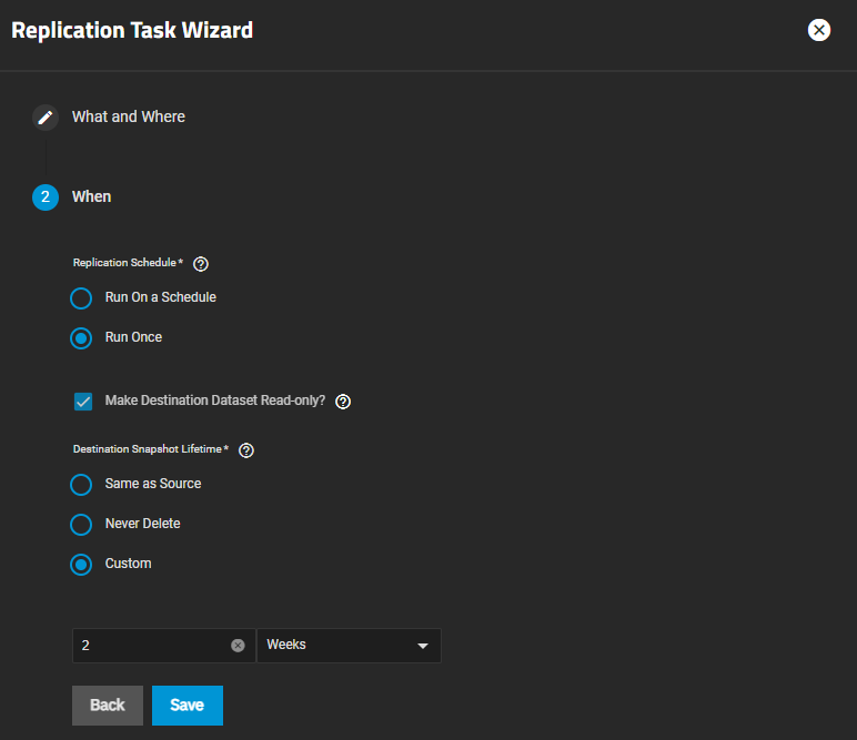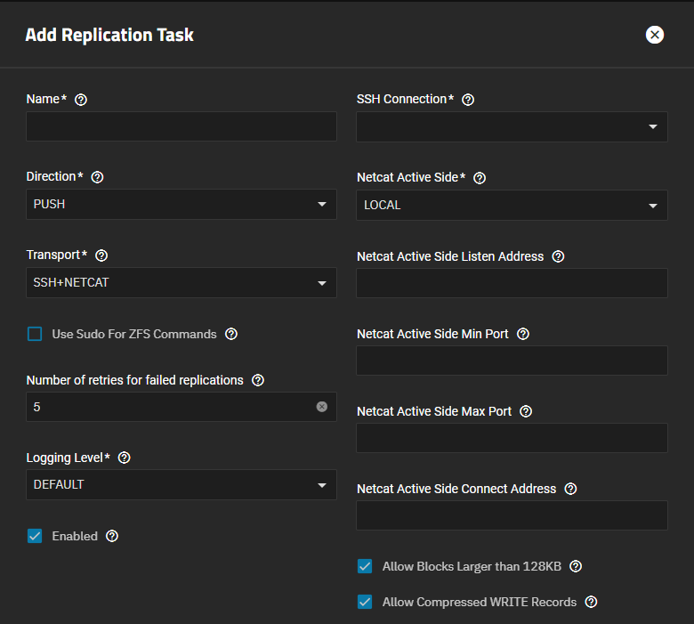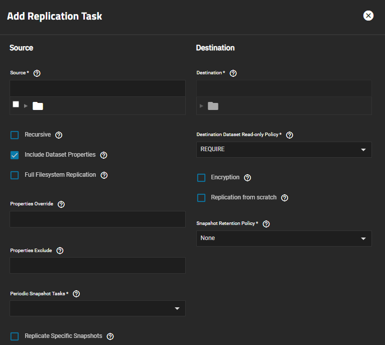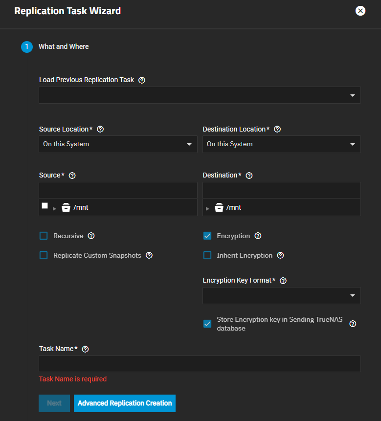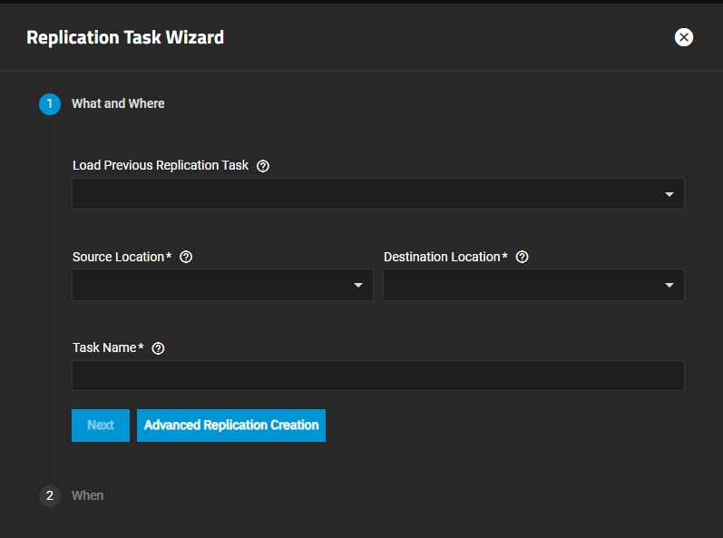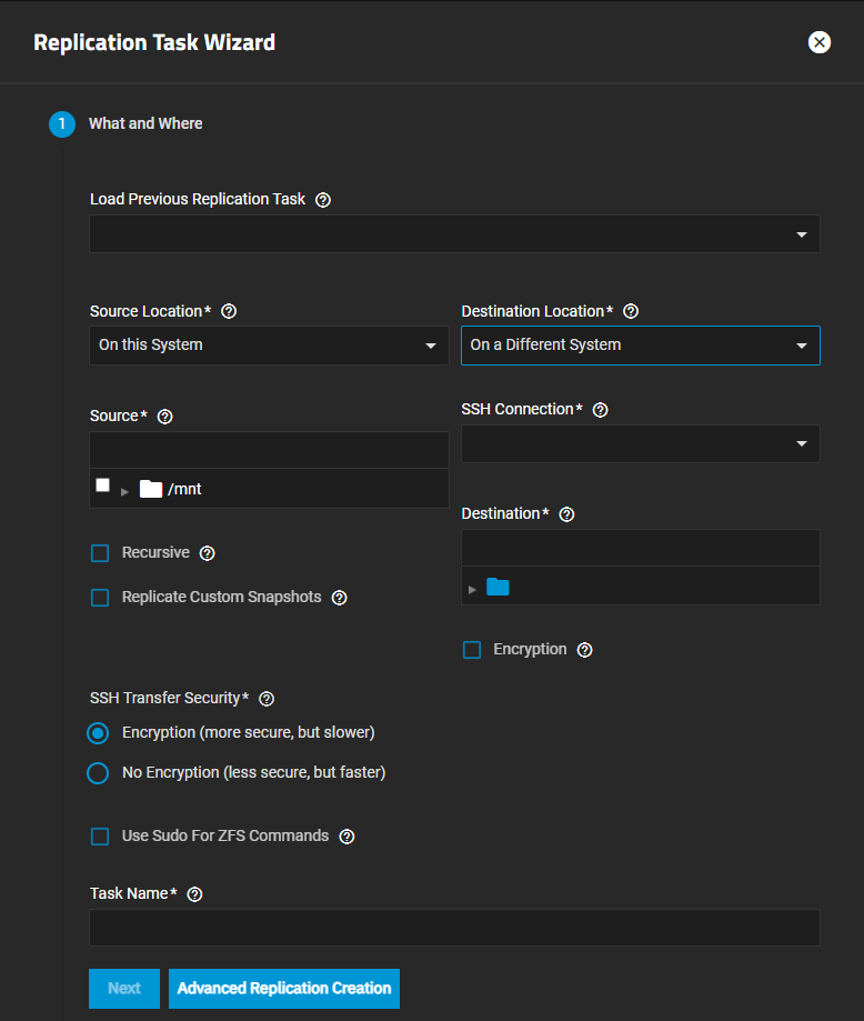 Advanced Replication Creation opens the Add Replication Task screen with the same settings found in the wizard and more advanced settings. If you populate wizard settings and then click Advanced Replication Creation, TrueNAS shows you the dialog asking you to confirm you want to leave the screen. After clicking Yes the Add Replication Task screen opens but values entered in the wizard are not transfered to the Add Replication Task screen.