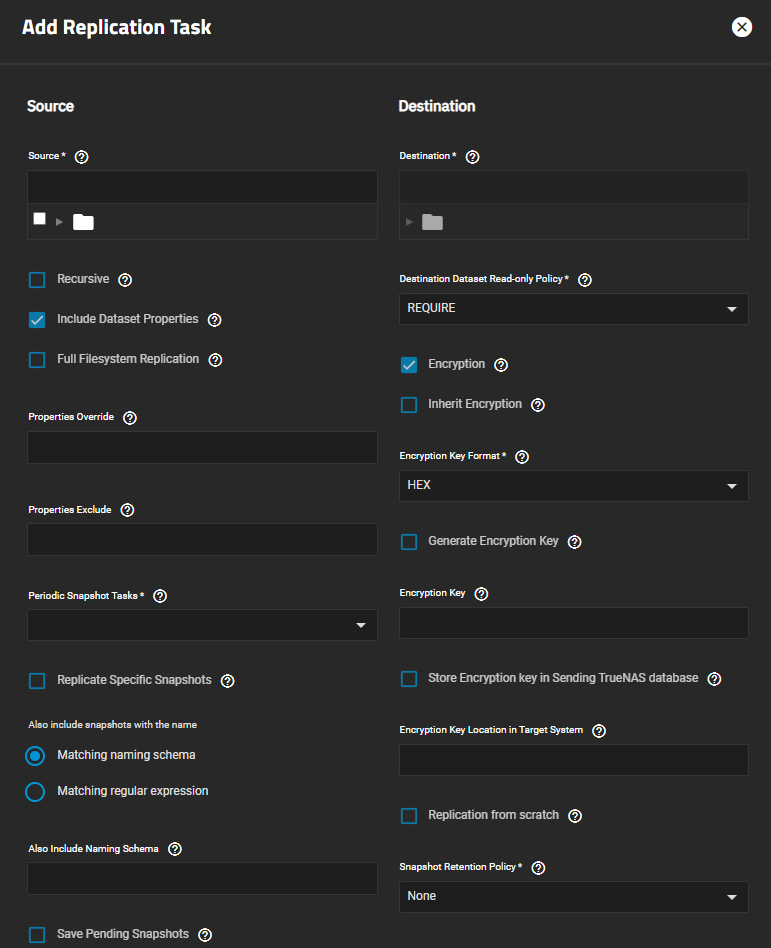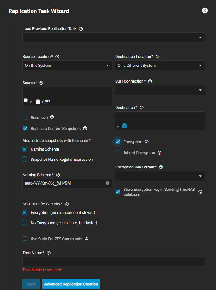 The Encryption and SSH Connection options show when the source or destination is set to On a Different System. Encryption applies another layer of protection to the data transfer; it is not the encryption of the data stored or the dataset. You can use an existing SSH connection created using the Credentials > Backup Credentials > SSH Connection screen or create a new connection through the replication task wizard or screens. SeeConfigure SSH for more information on adding a Backup Credential SSH credentials.